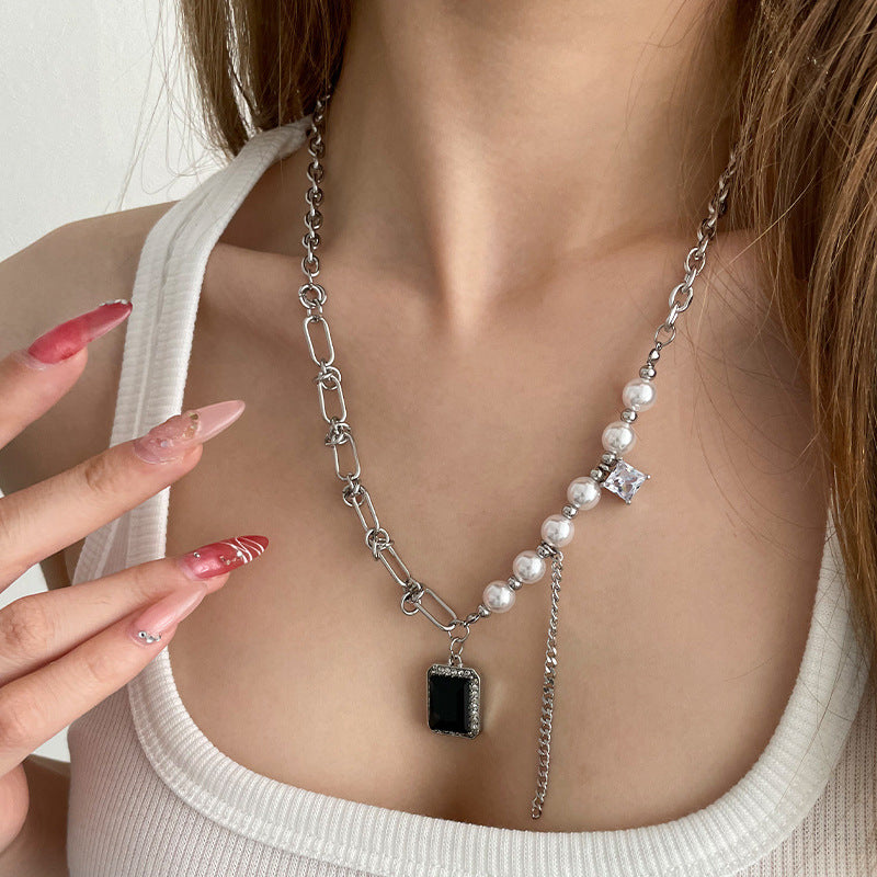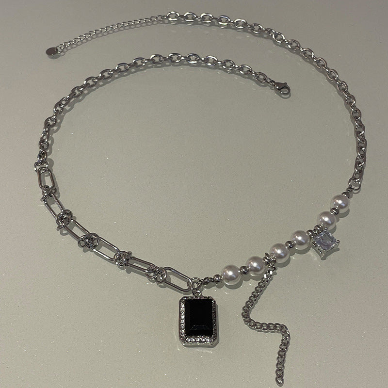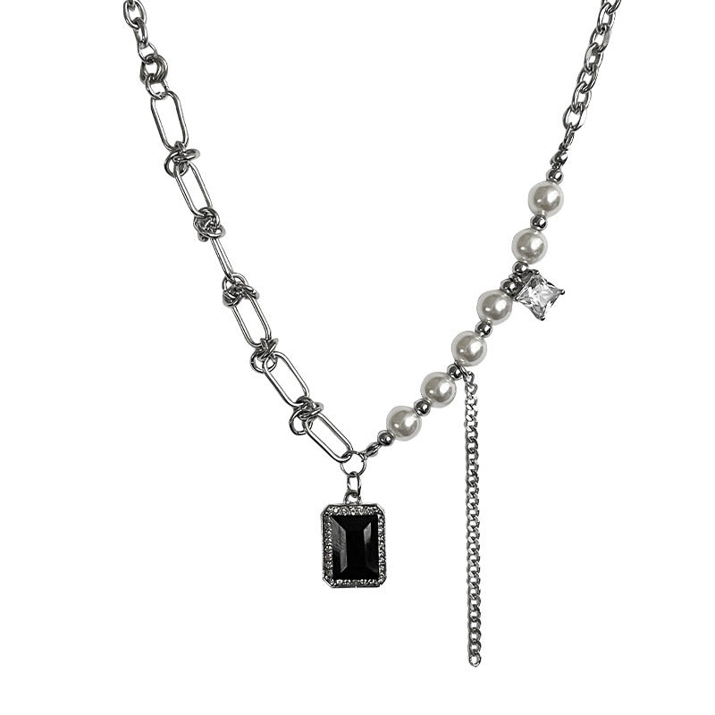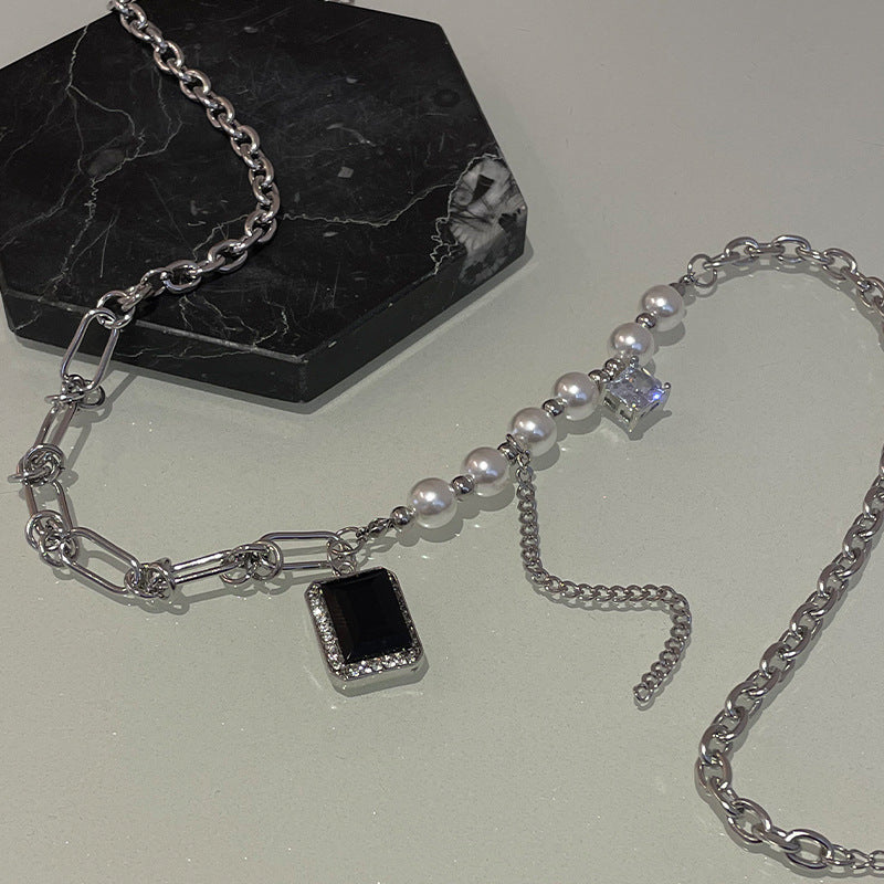 Black Square Diamond Pearl Tassel Necklace